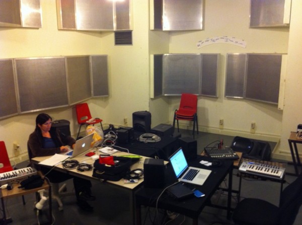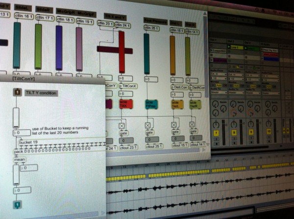 The main aim was to stabilise the instrument and develop some software patches in JunXion,PD and Ableton Live (Donna’s computer), and in Max/MSP and Ableton Live (Julian’s computer) that would serve as the basis for a new collaborative composition. Good progress was made against these aims during the week in residence. This new work will extend the use of sensors to Julian’s electric guitar (via an Arduino board and sensors) so that full performance gesture capture and exchange can occur.